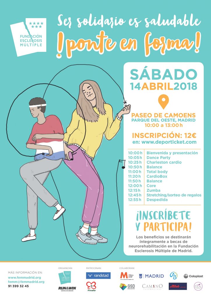 Sensibilizar en torno a la Esclerosis Múltiple, promover el ejercicio y la vida sana, así como captar fondos para el programa de becas de rehabilitación neurológica de la Fundación Esclerosis Múltiple de Madrid (FEMM) son los objetivos de ‘Ser solidario es saludable ¡ponte en forma!’, una nueva acción de sensibilización que tendrá lugar el sábado 14 de abril, de 10:00 a 13:00 h., en el Parque del Oeste.